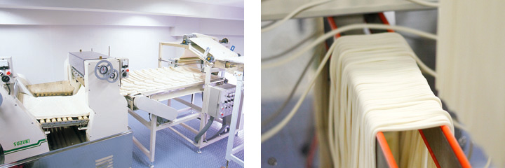 「乾麺でも打ち立ての味を再現したい。」この想いを実現させるため、国内初の手打式乾麺製造に成功、独自開発による半生麺工場ができ、さらなる進化を遂げました。今では、国内最大級の供給能力と手打ちに負けないおいしいうどんづくりの技術を持ち、世界へ羽ばたいています。