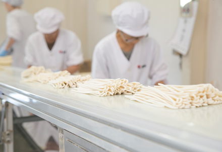 創業は明治30年。伝統に支えられて独特の製法を守り、讃岐うどん本来のうまさを継承している藤井製麺。原料の徹底した吟味から、塩加減、水加減、練り加減という3大要素を守ったおいしいうどんが自慢です。生産規模が大きくなった今でも、打ち立てのうどんを食卓へという基本理念の下、手作りのコツや職人芸をそのまま受け継いだ高品質の製品作りを行っています。