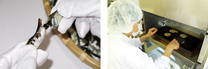 「お魚せんべい」の作り方は単純ですが、とても手間がかかります。カタクチイワシには、とれる時期によって2cmぐらいの「ちりめん」から8cm以上の「大羽(おおば)」まで様々。小さな「ちりめん」などは、そのまま使いますが、大きくなった「大羽」は苦味をなくすために手作業で内臓を取り除きます。そうしてせんべいになる準備ができたイワシを、高温・高圧でプレスします。つなぎとなる小麦粉などは一切使いません。