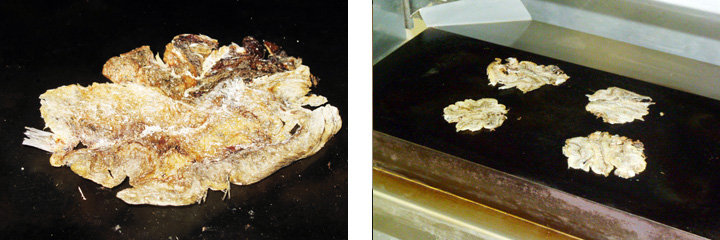 ちりめんはそのまま焼き上げますが、いわし (大羽) は、頭と内臓の苦味が強いため、1尾ずつ丁寧に取り除きます。つなぎは一切使わずに1尾ずつ鉄板の上に乗せて、高温、高圧力をかけるだけで、ふわふわパリパリとしたおせんべいになります。